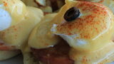 イングリッシュマフィンに薄くスライスしたハムと半熟のポーチドエッグを乗せ、ベアルネーズソース(白ワインと香草で風味をつけたソース)で仕上げています。